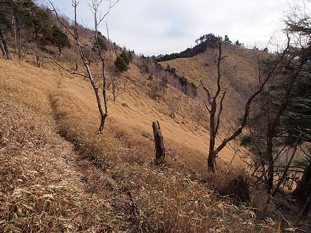 ↓こちらの写真に描いた矢印。西側樹林帯の登山道が崩壊していたので、笹が生い茂る東斜面のけもの道に迂回しました。
