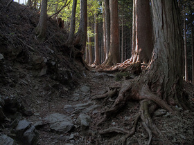 ひんやりした空気に木漏れ日を浴びる快適な山道。