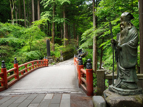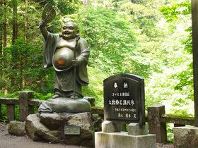 『神社入り口より約700メートルの参道は清流に添い、老杉が空を蔽い、巨岩奇岩に心打たれ森厳極まりなく、本殿に到着した時には身も心も洗われております。』